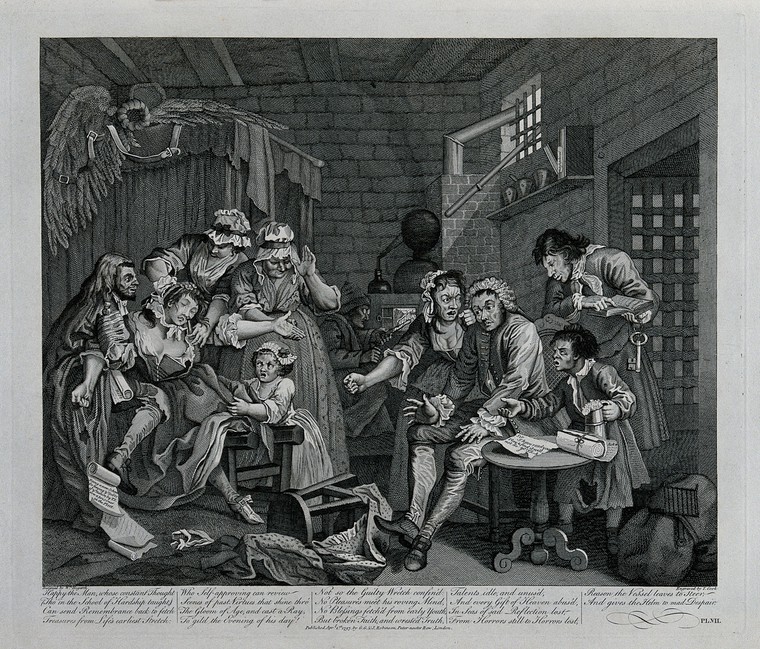 ‘Tom Rakewell in a cell in the Fleet Prison. Engraving by T. Cook after W. Hogarth.’ by William Hogarth. Credit: Wellcome Collection. CC BY.